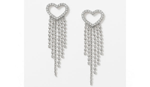 These heart-shaped drop earrings are the ultimate blend of romance and drama. Hand-set with micro pavé crystals that outline a perfectly sculpted heart, each earring features a cascade of delicate chain fringe that dances with light at every turn. Lightweight yet impactful, they’re designed for those nights (or days) when subtle just won’t do.